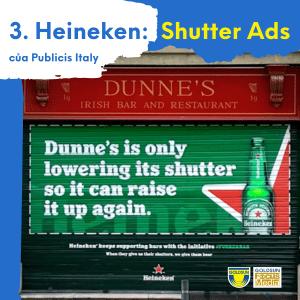 Đối với chiến dịch ‘Shutters’ của mình, Heineken đã chuyển hướng và lựa chọn phân bổ ngân sách dành cho quảng cáo ngoài trời nhiều hơn để hỗ trợ các đối tác thương mại bị ảnh hưởng bởi việc giãn cách xã hội. Hãng đã trả tiền cho các cửa hàng và quán bar ở Argentina, Đức, Indonesia, Ý và Tây Ban Nha để hiển thị quảng cáo như ‘Xem quảng cáo này hôm nay, thưởng thức quán bar này vào ngày mai’ trên cửa sổ và cửa chớp của họ.