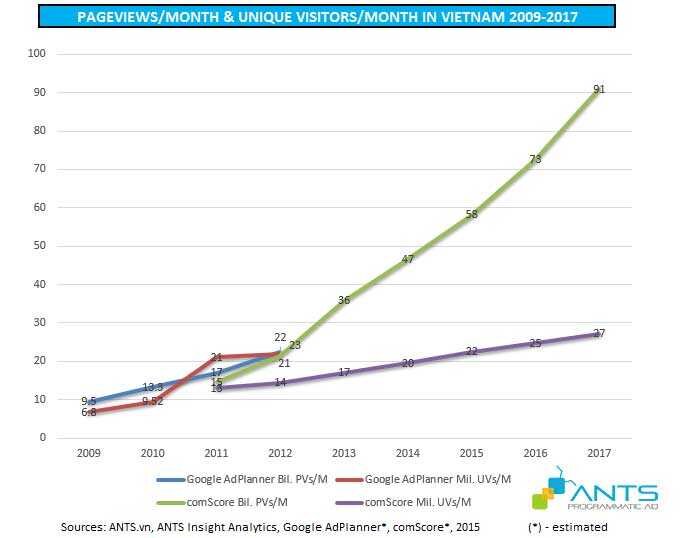 - Mobile Users – Số lượng độc giả đọc tin tức trên Facebook ngày một nhiều, người dùng mobile internet Việt Nam đạt ngưỡng 17 triệu người dùng (Bảng 4) dẫn đến sụt giảm pageviews trên desktop của các trang tin tức & báo điện tử. Mặc dù pageviews trên mobile tăng mạnh nhưng các nhãn hàng chưa chi mạnh cho quảng cáo mobile và Publishers cũng chưa sẵn sàng sản phẩm & công nghệ quảng cáo trên mobile.