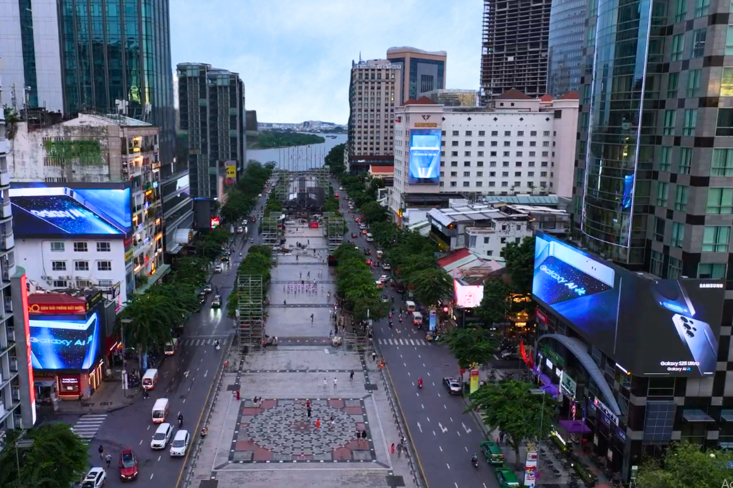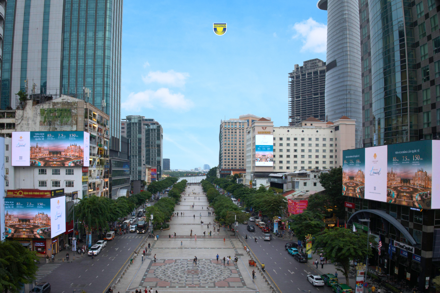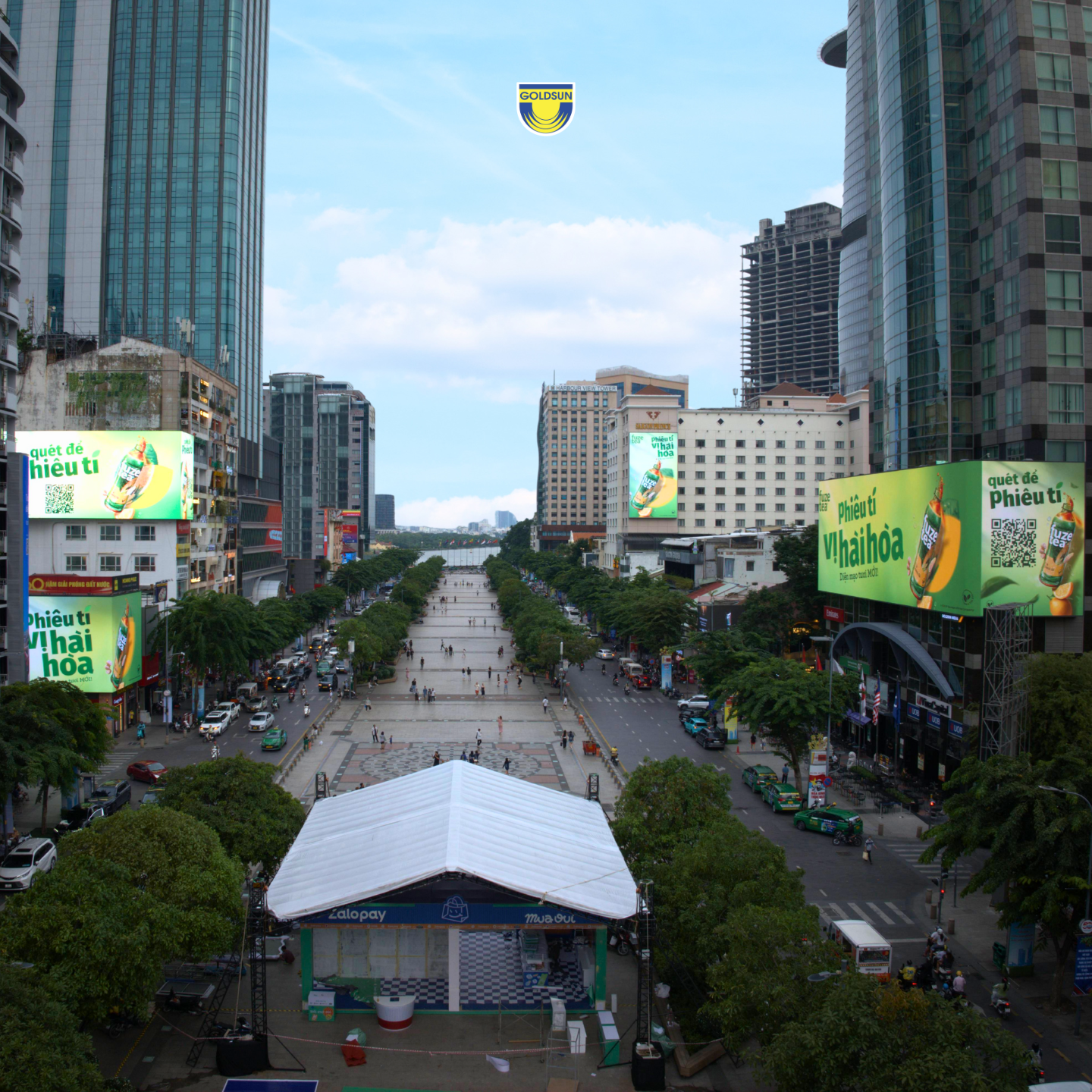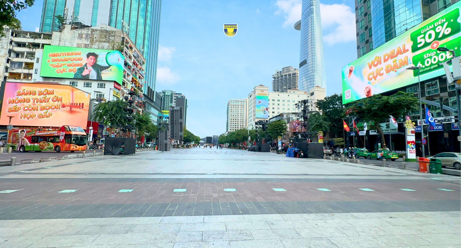 Cùng một nội dung xuất hiện đồng thời tại 4 màn hình LED lớn, đặt tại bốn vị trí chiến lược trên phố đi bộ Nguyễn Huệ, tạo nên “tổ hợp quảng cáo” quy mô lớn, phủ trọn không gian công cộng sầm uất bậc nhất Sài Gòn. Sự đồng bộ này mang đến hiệu ứng thị giác đặc biệt mạnh mẽ, giúp thương hiệu chiếm lĩnh tầm nhìn người đi bộ, người tham quan, và cả cư dân nội đô lẫn khách du lịch quốc tế.