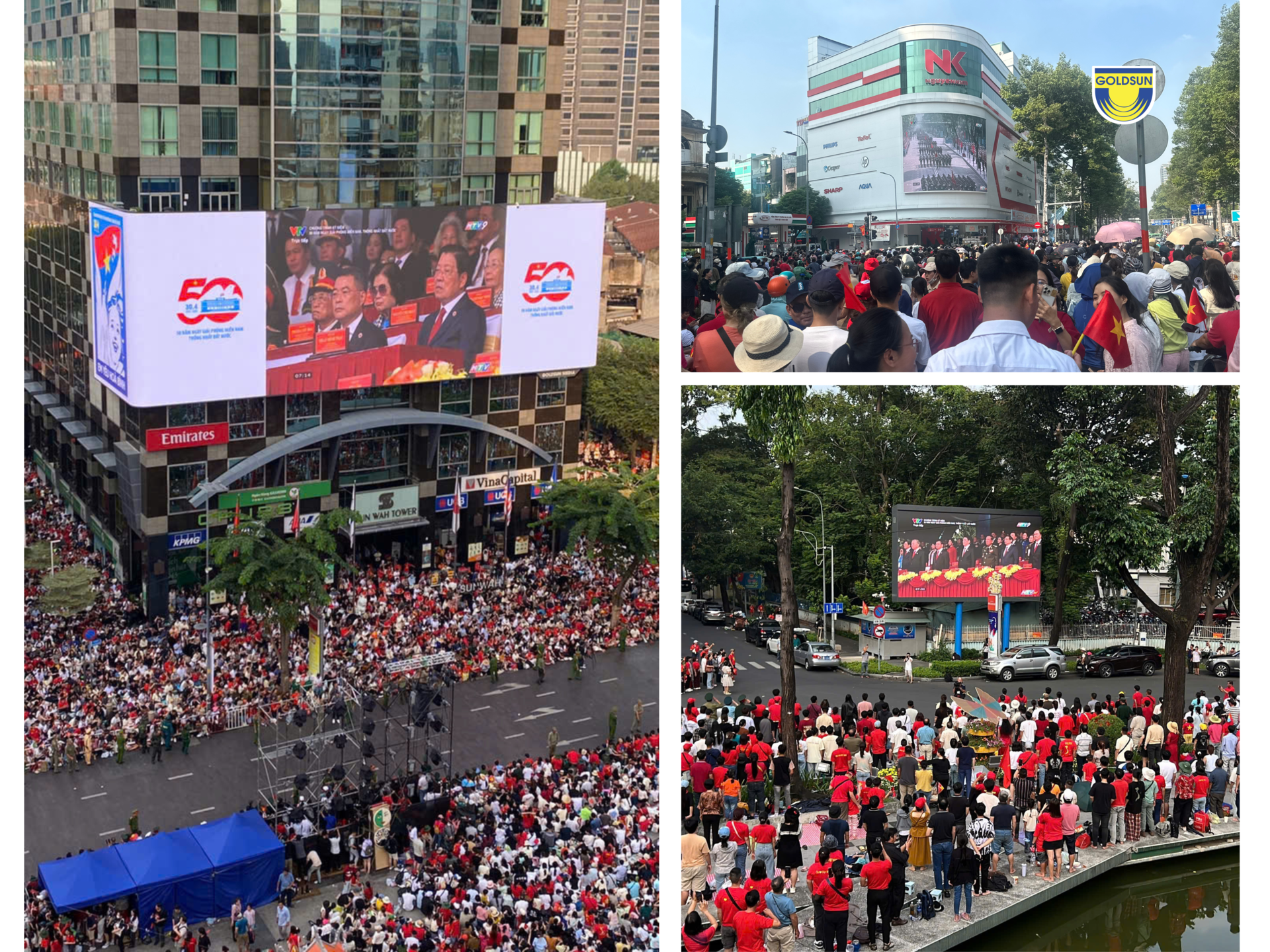 Một trong những bước đi đột phá gần đây của Goldsun Media là việc triển khai đồng bộ hoá nội dung trên 4 màn hình lớn tại phố đi bộ Nguyễn Huệ – TP. Hồ Chí Minh, tạo nên một trải nghiệm thị giác cộng hưởng, không chỉ thu hút ánh nhìn mà còn tạo dấu ấn mạnh mẽ trong tâm trí người xem. Theo nghiên cứu về truyền thông thị giác, nội dung đồng bộ trên nhiều điểm hiển thị có thể tăng đến 42% khả năng ghi nhớ thương hiệu – một minh chứng cho hiệu quả truyền thông vượt trội mà Goldsun Media đang hướng đến.